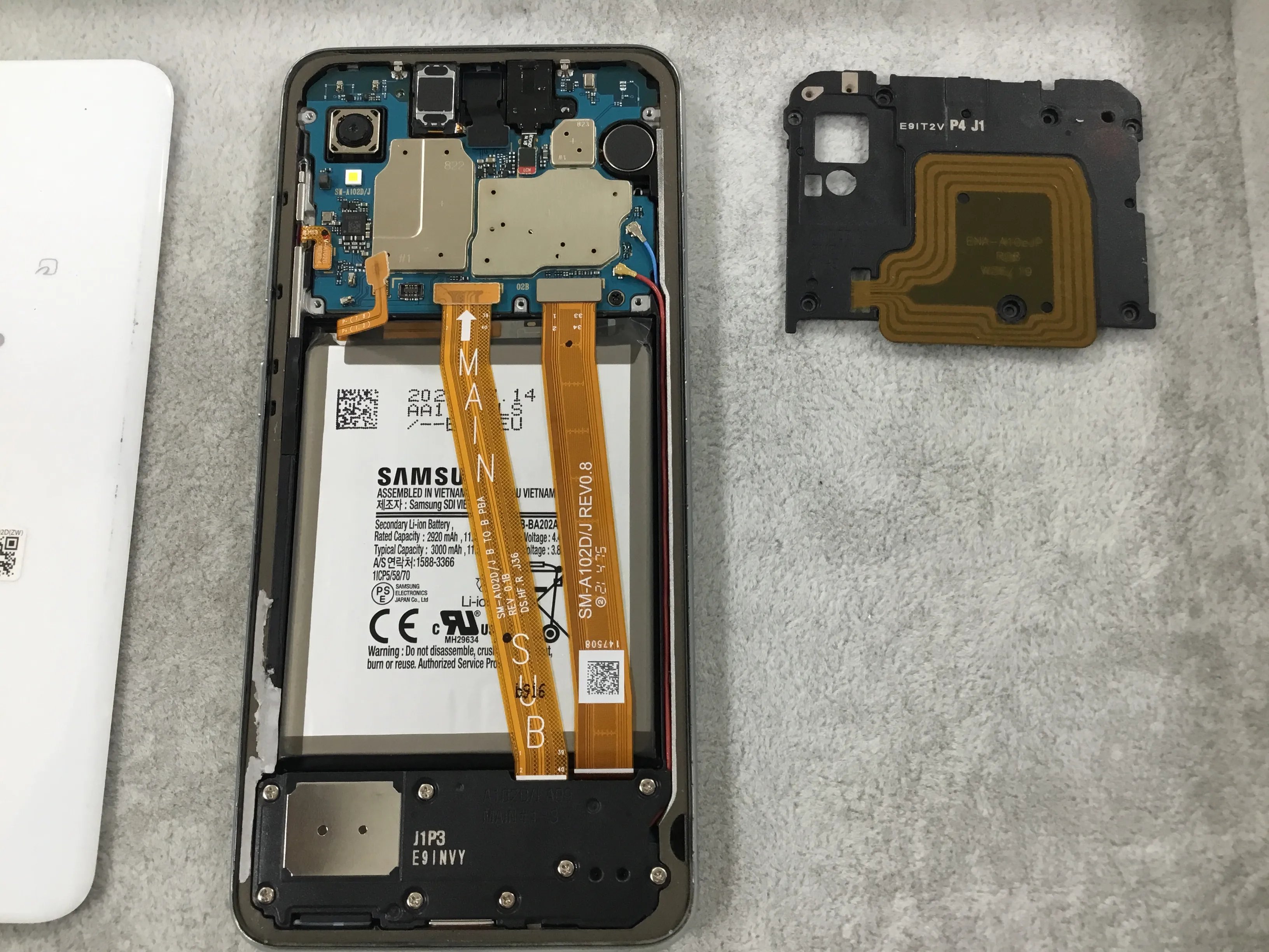 写真は今回の修理端末の分解中の状態ですがカメラのコネクタが基板裏側に配置されているので基板を一度取り外す必要がありました。