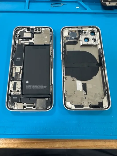 今回の状態は、iPhone 13を落としてしまい、裏面のガラスがバキバキに割れてしまったというものです。iPhone 13は裏面のガラスが修理しにくい構造になっているため、修理方法によっては時間がかかることがあります。その中でも、フレーム交換が最も短時間で完了するため、おすすめの修理方法です。